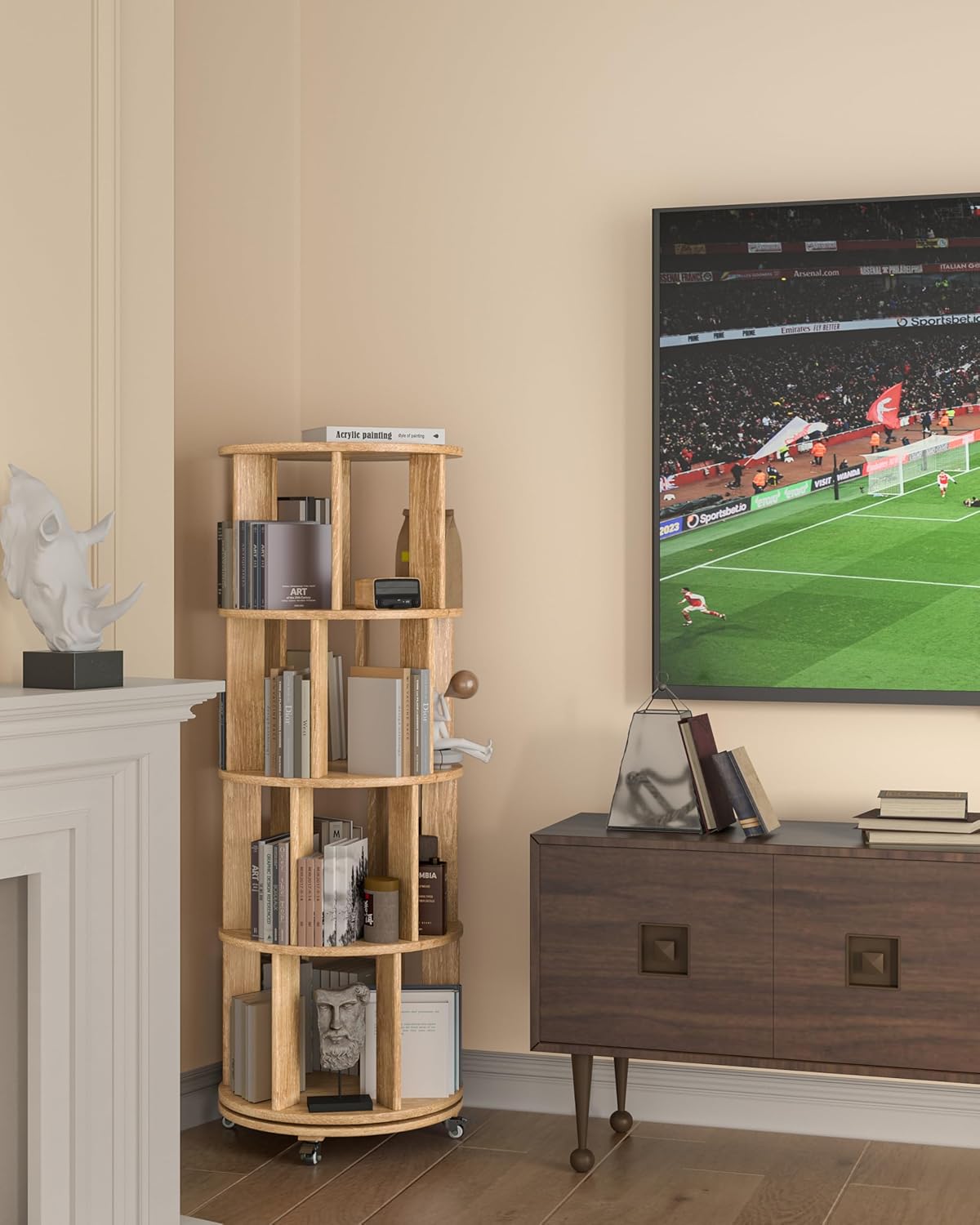 With up to 120 books capacity (20 per tier) and 65 lbs weight limit per level, this revolving shelf makes the most of vertical space. Its compact circular design fits perfectly in corners, making it a smart addition to small apartments or cozy reading nooks.